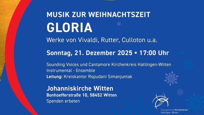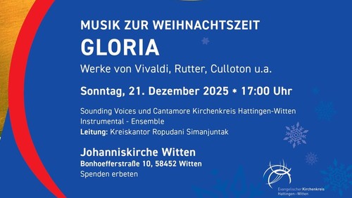 Weihnachtskonzert „Gloria“: ein Abend voller musikalischer Stimmungen. Cantamore und die Sounding Voices laden zu ihrem Weihnachtskonzert „Gloria“ ein, begleitet vom Instrumentalensemble des Kirchenkreises. Der Abend entfaltet sich als ein Fluss musikalischer Stimmungen: festlich, erzählend, berührend und still. Die Chöre wechseln ab, singen gemeinsam und schaffen ein ausgewogenes, feierliches Klangbild. Den Abschluss bildet ein strahlendes gemeinsames Finale, das die Stille des Abends in festliche Wärme verwandelt.